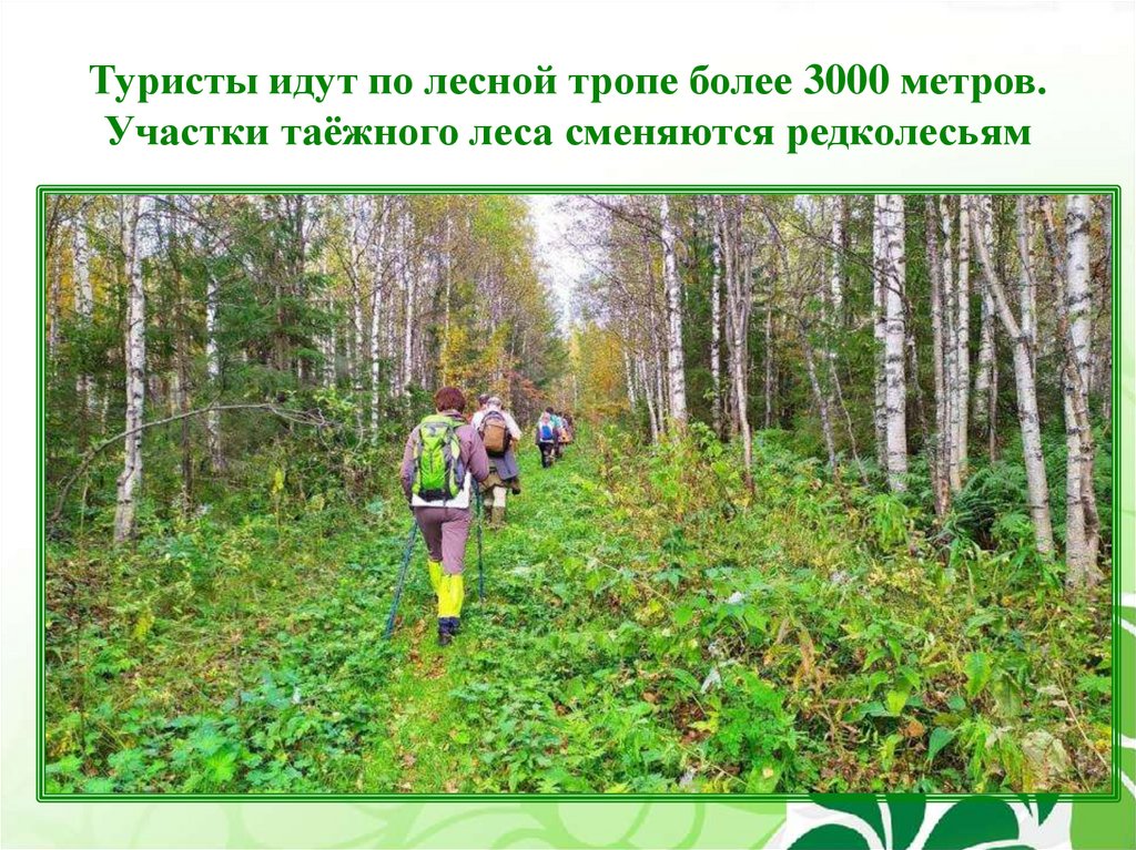 Туристы идут по лесной тропе более 3000 метров.Участки таёжного леса сменяются редколесьям