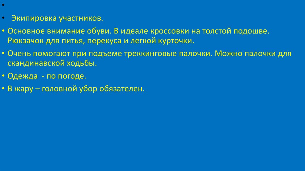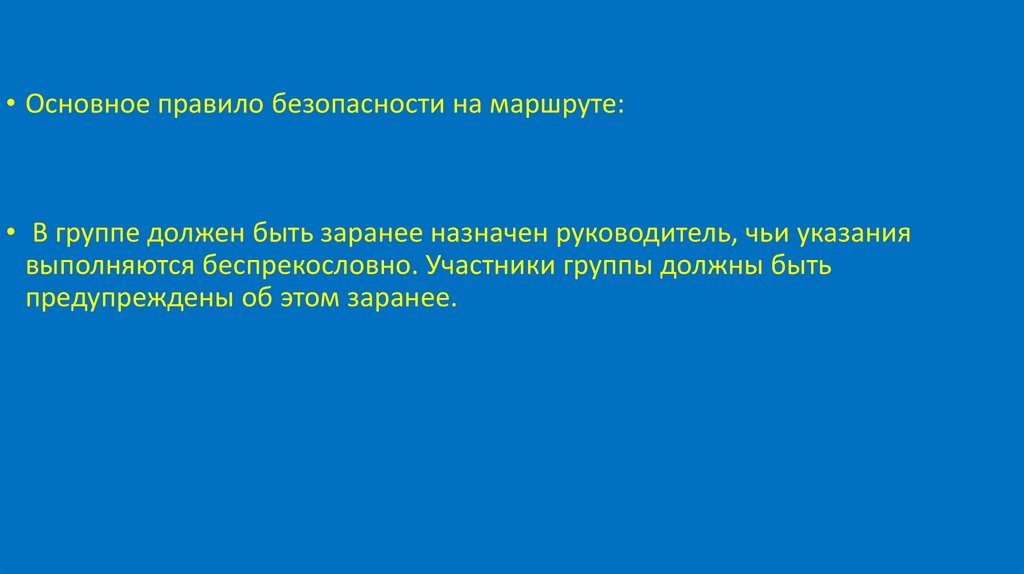 • Основное правило безопасности на маршруте:• В группе должен быть заранее назначен руководитель, чьи указания