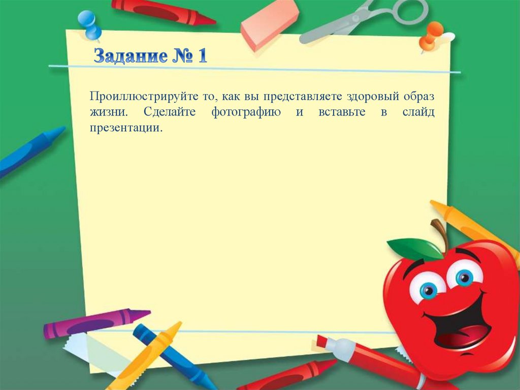 Проиллюстрируйте то, как вы представляете здоровый образжизни. Сделайте фотографию и вставьте в слайд