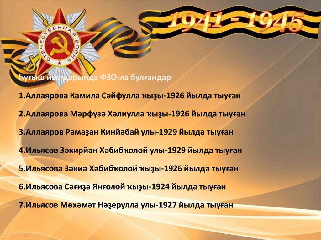 Һуғыш йылдарында ФЗО-ла булғандар1.Аллаярова Камила Сәйфулла ҡыҙы-1926 йылда тыуған