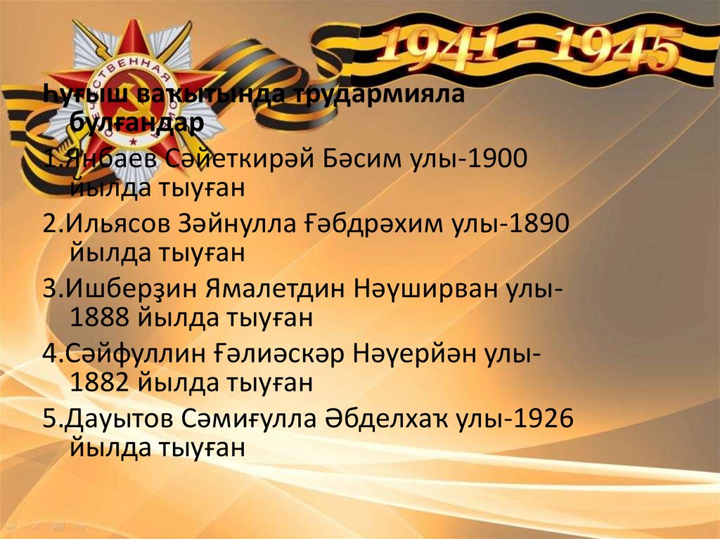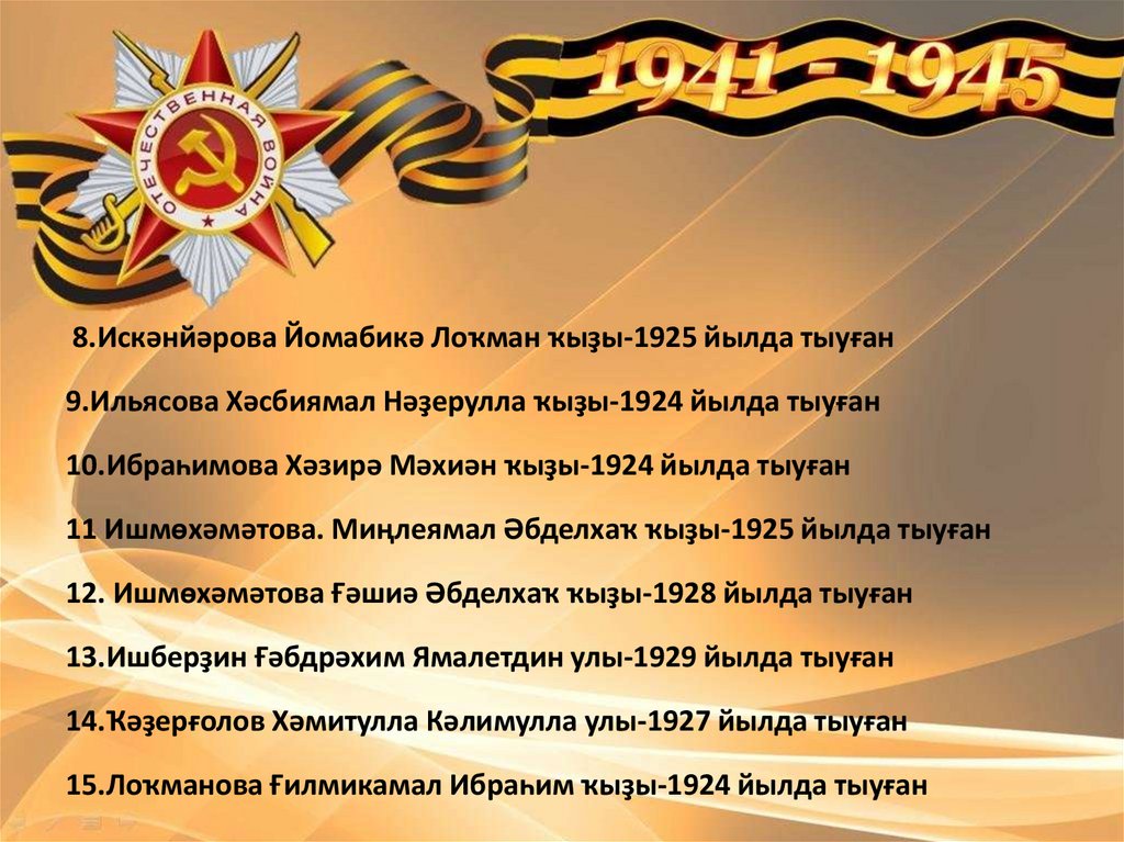 8.Искәнйәрова Йомабикә Лоҡман ҡыҙы-1925 йылда тыуған9.Ильясова Хәсбиямал Нәҙерулла ҡыҙы-1924 йылда тыуған