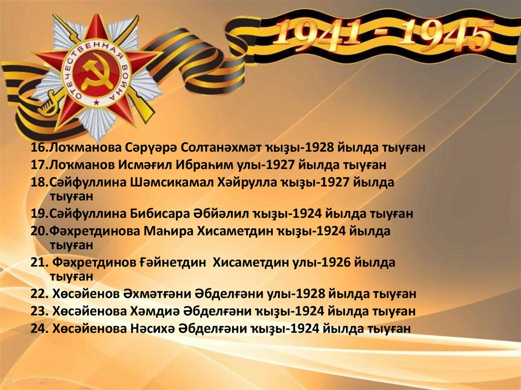 16.Лоҡманова Сәрүәрә Солтанәхмәт ҡыҙы-1928 йылда тыуған17.Лоҡманов Исмәғил Ибраһим улы-1927 йылда тыуған