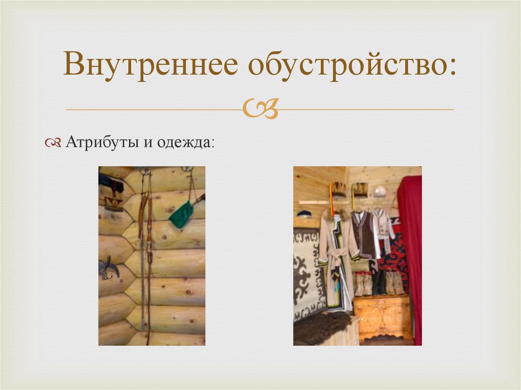 Внутреннее обустройство:Атрибуты и одежда: