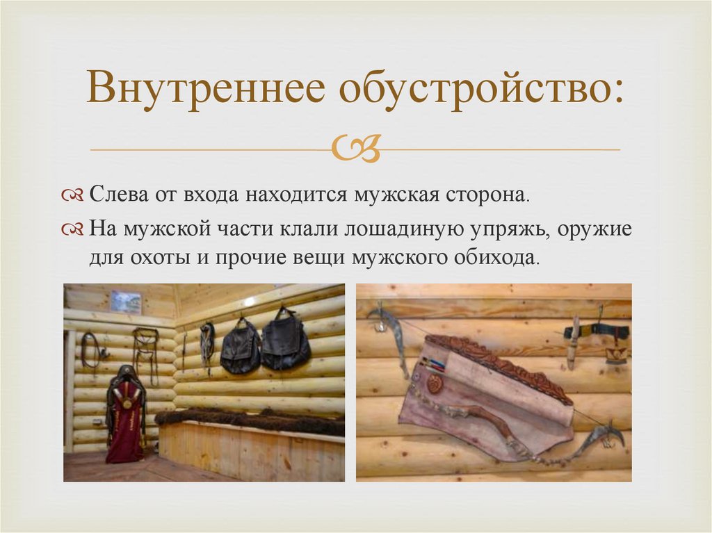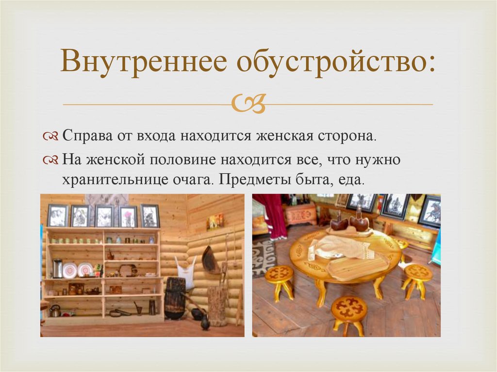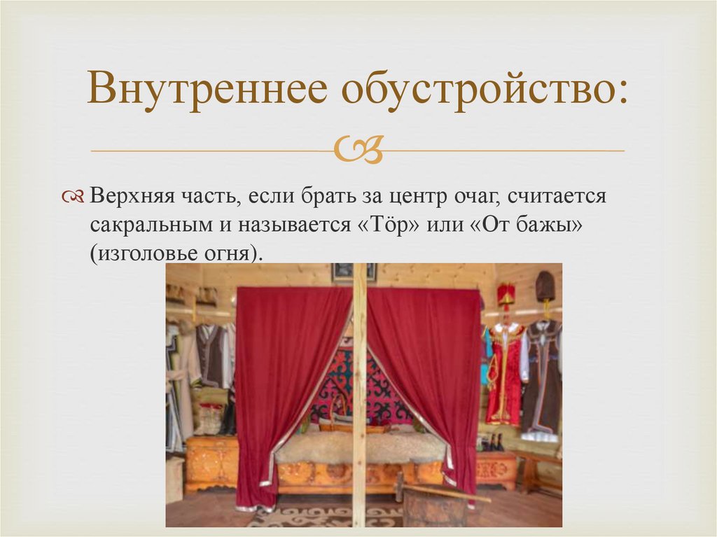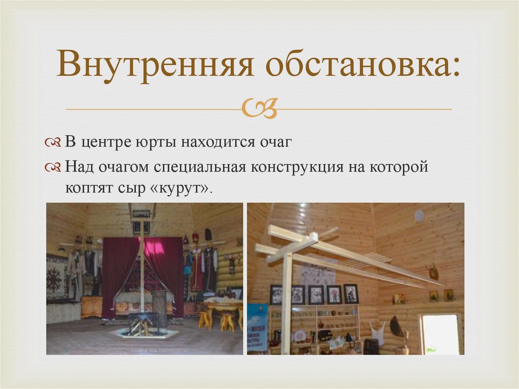 Внутренняя обстановка:В центре юрты находится очаг