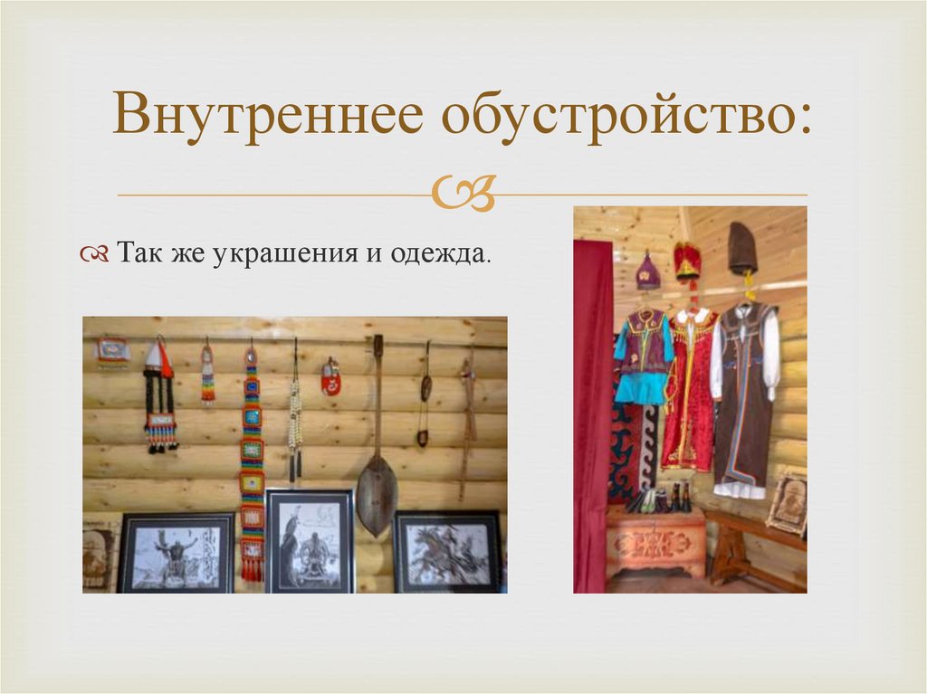 Внутреннее обустройство:Так же украшения и одежда.