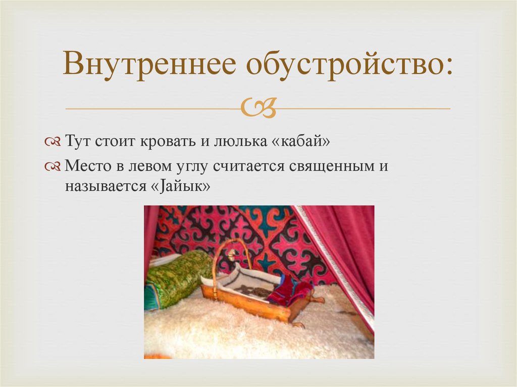 Внутреннее обустройство:Тут стоит кровать и люлька «кабай»