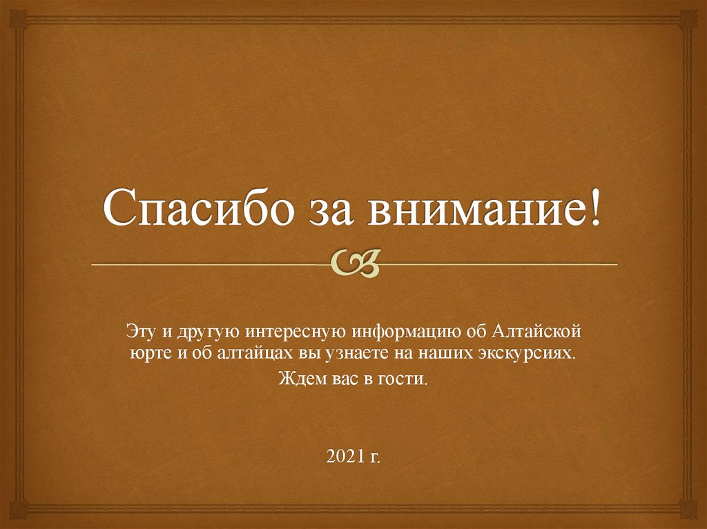 Эту и другую интересную информацию об Алтайскойюрте и об алтайцах вы узнаете на наших экскурсиях.