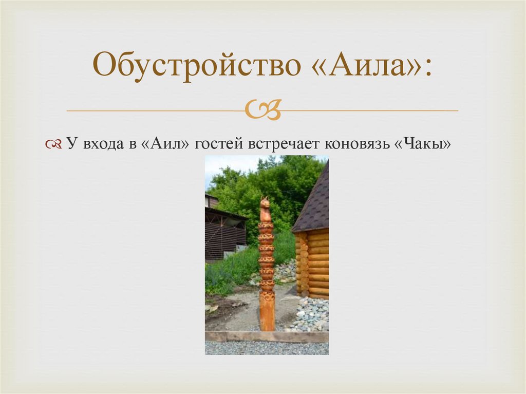 Обустройство «Аила»:У входа в «Аил» гостей встречает коновязь «Чакы»