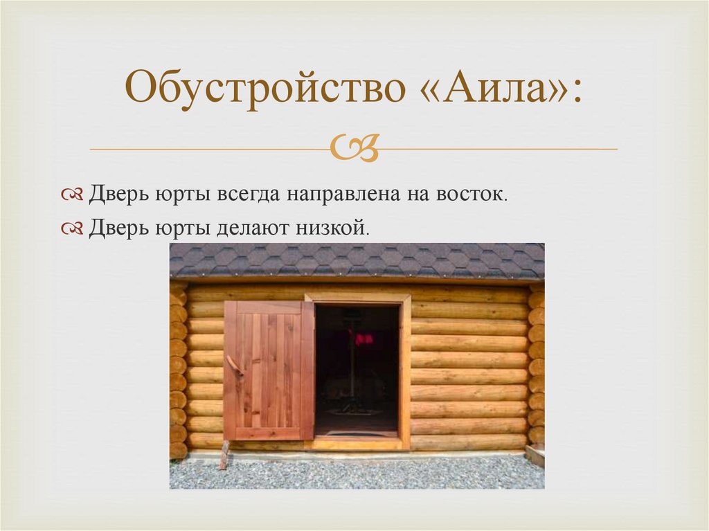 Обустройство «Аила»:Дверь юрты всегда направлена на восток.