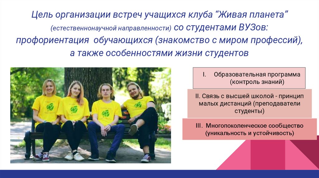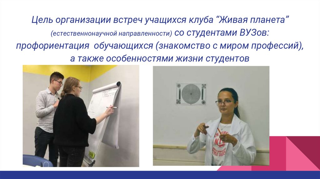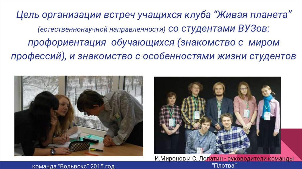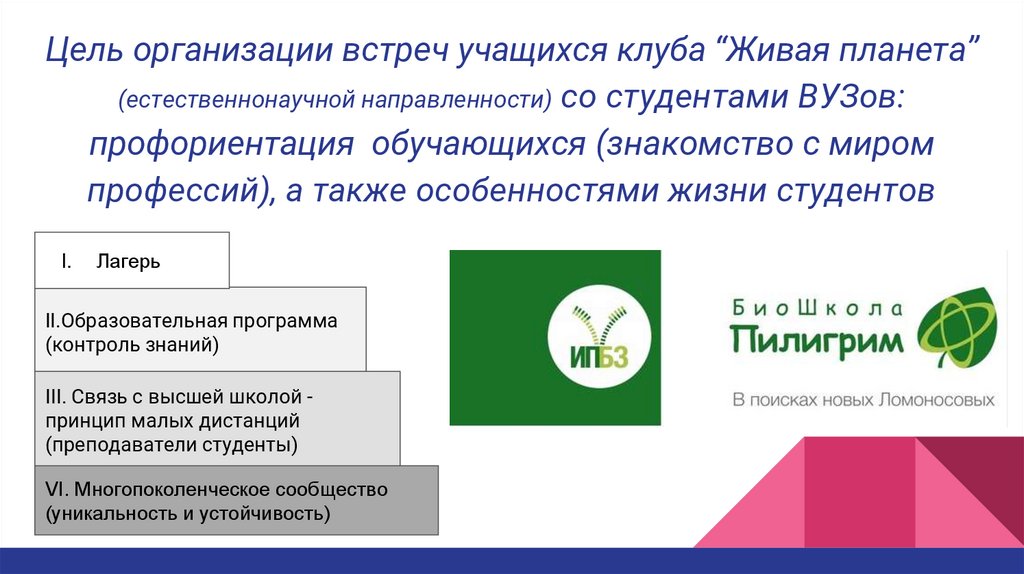 Цель организации встреч учащихся клуба “Живая планета”(естественнонаучной направленности) со студентами ВУЗов: