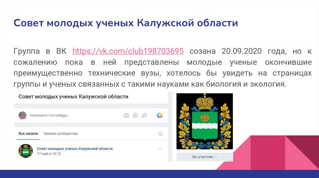 Совет молодых ученых Калужской областиГруппа в ВК https://vk.com/club198703695 созана 20.09.2020 года, но к