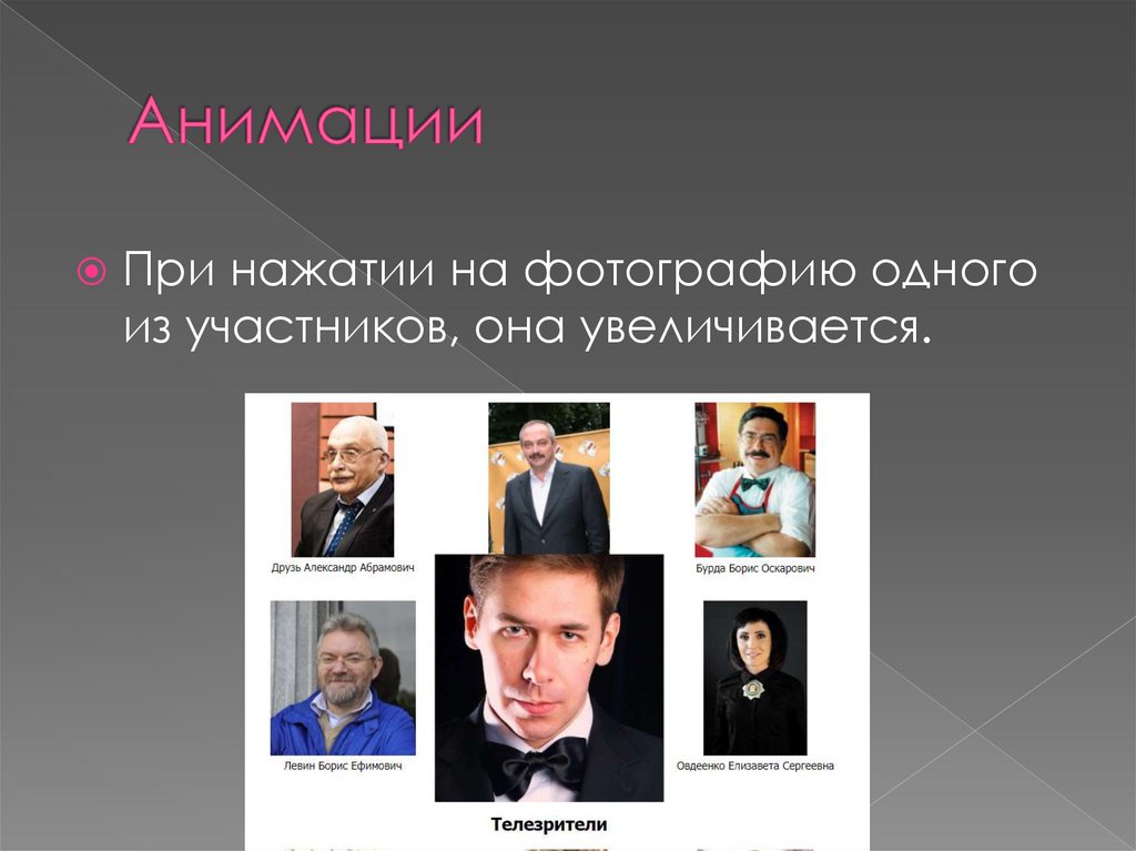 При нажатии на фотографию одногоиз участников, она увеличивается.
