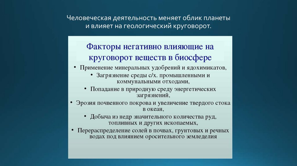 Человеческая деятельность меняет облик планетыи влияет на геологический круговорот.