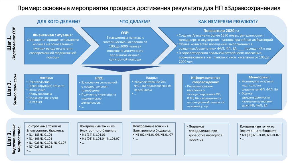 Пример: основные мероприятия процесса достижения результата для НП «Здравоохранение»Шаг 3.