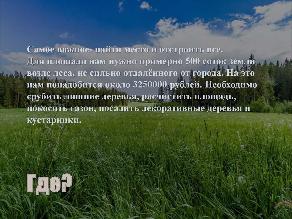 Самое важное- найти место и отстроить все.Для площади нам нужно примерно 500 соток земли