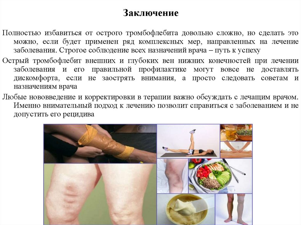 ЗаключениеПолностью избавиться от острого тромбофлебита довольно сложно, но сделать это