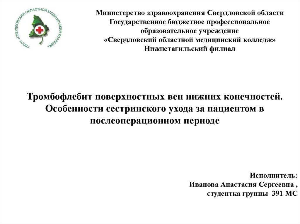 Тромбофлебит поверхностных вен нижних конечностей. Особенности сестринского ухода за пациентом в послеоперационном периоде