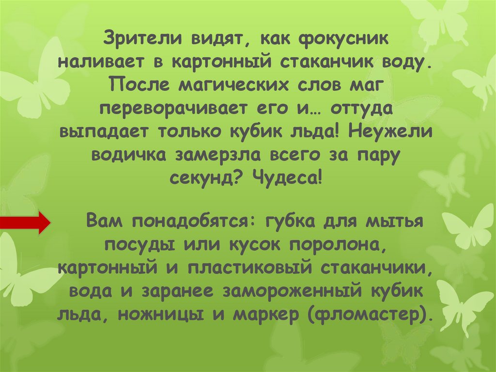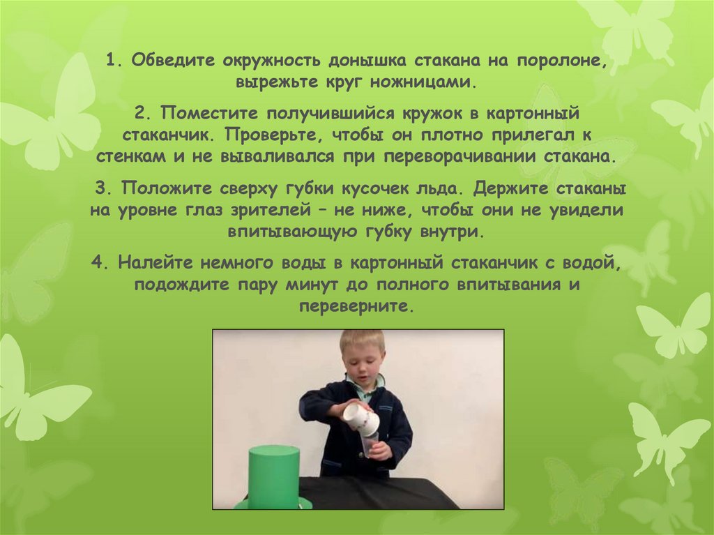Зрители видят, как фокусникналивает в картонный стаканчик воду.