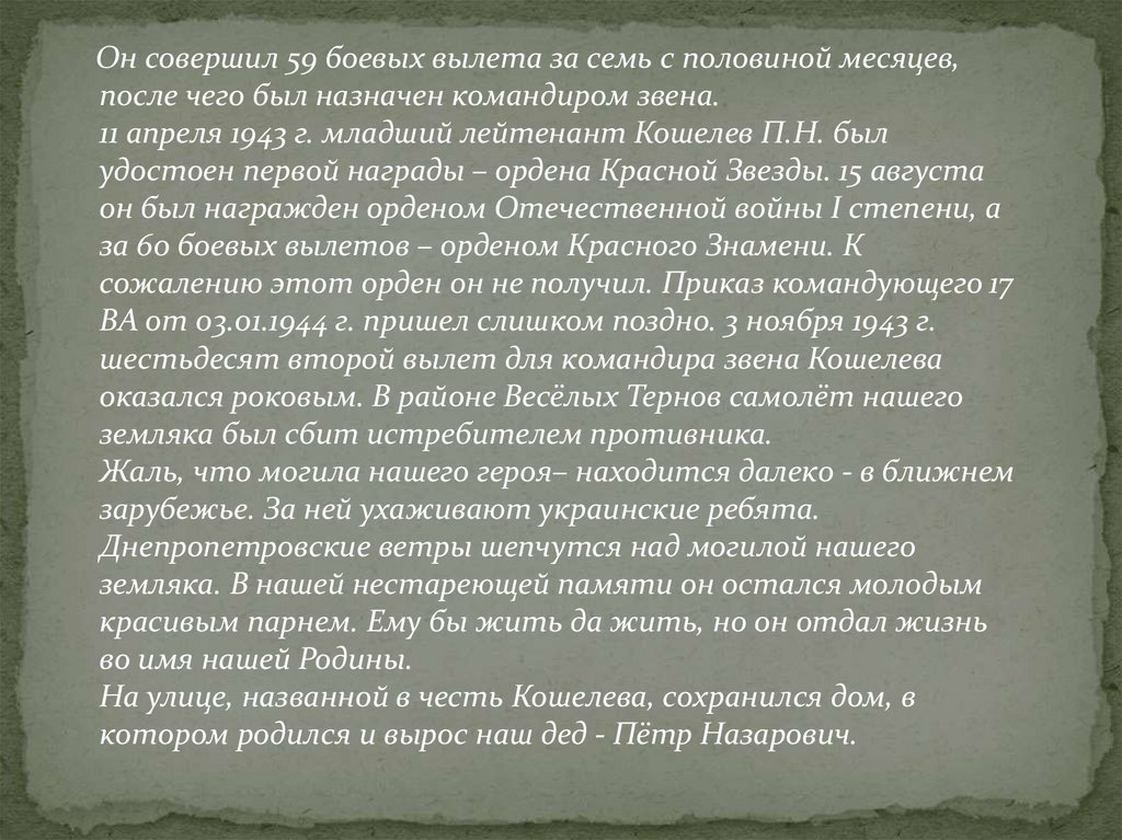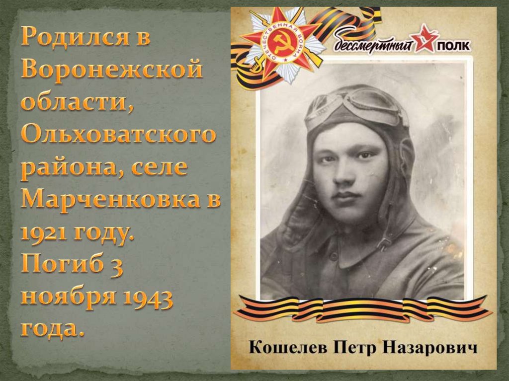 11 апреля 1943 г. младший лейтенант Кошелев П.Н. был