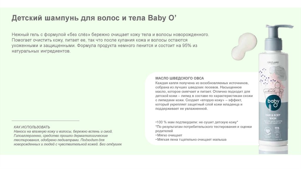 Детский шампунь для волос и тела Baby O’Нежный гель с формулой «без слёз» бережно очищает кожу тела и волосы новорожденного.