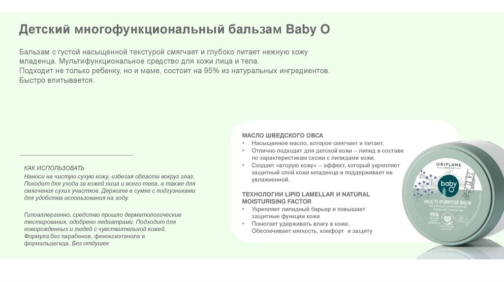 Детский многофункциональный бальзам Baby OБальзам с густой насыщенной текстурой смягчает и глубоко питает нежную кожу