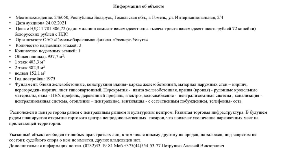 Информация об объектеМестонахождение: 246050, Республика Беларусь, Гомельская обл., г. Гомель, ул. Интернациональная, 5/4