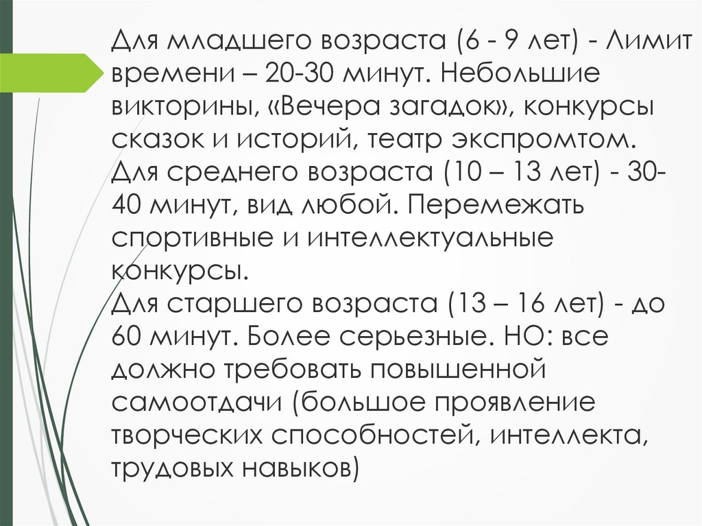 Для младшего возраста (6 - 9 лет) - Лимитвремени – 20-30 минут. Небольшие
