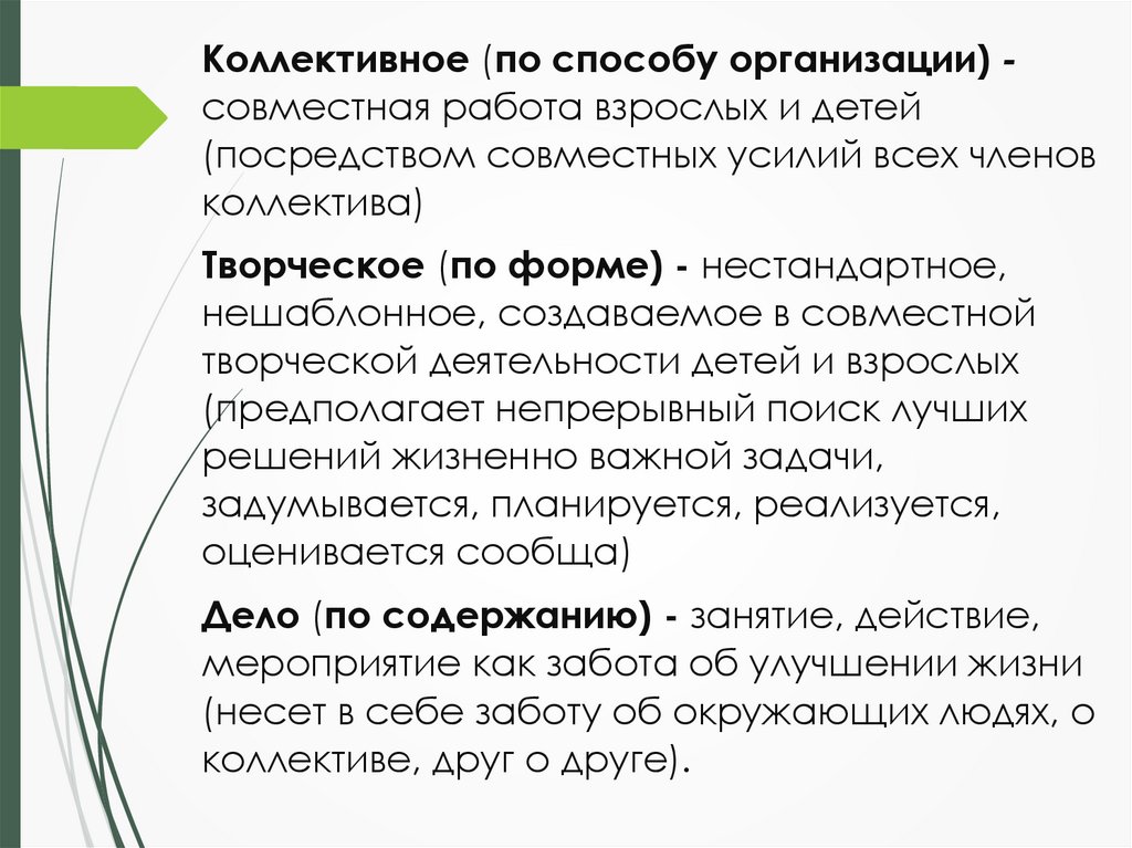 Коллективное (по способу организации) совместная работа взрослых и детей(посредством совместных усилий всех членов