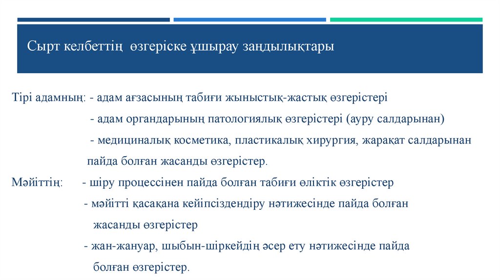Сырт келбеттің өзгеріске ұшырау заңдылықтарыТірі адамның: - адам ағзасының табиғи жыныстық-жастық өзгерістері