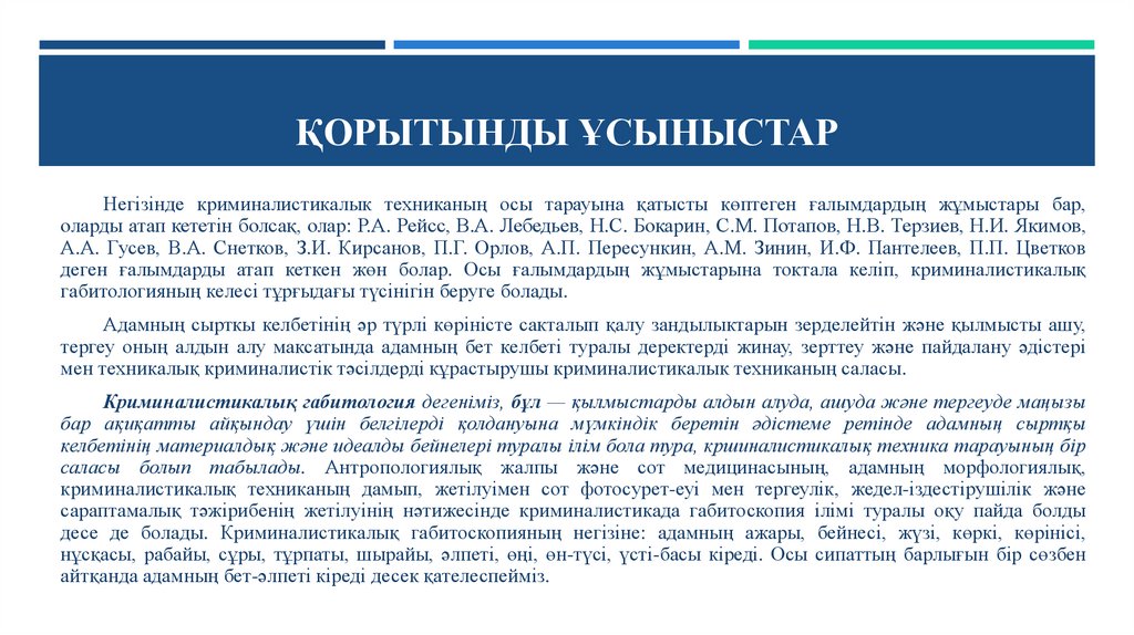 ҚОРЫТЫНДЫ ҰСЫНЫСТАРНегізінде криминалистикалык техниканың осы тарауына қатысты көптеген ғалымдардың жұмыстары бар,