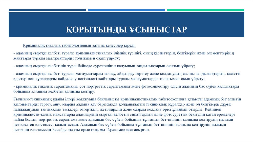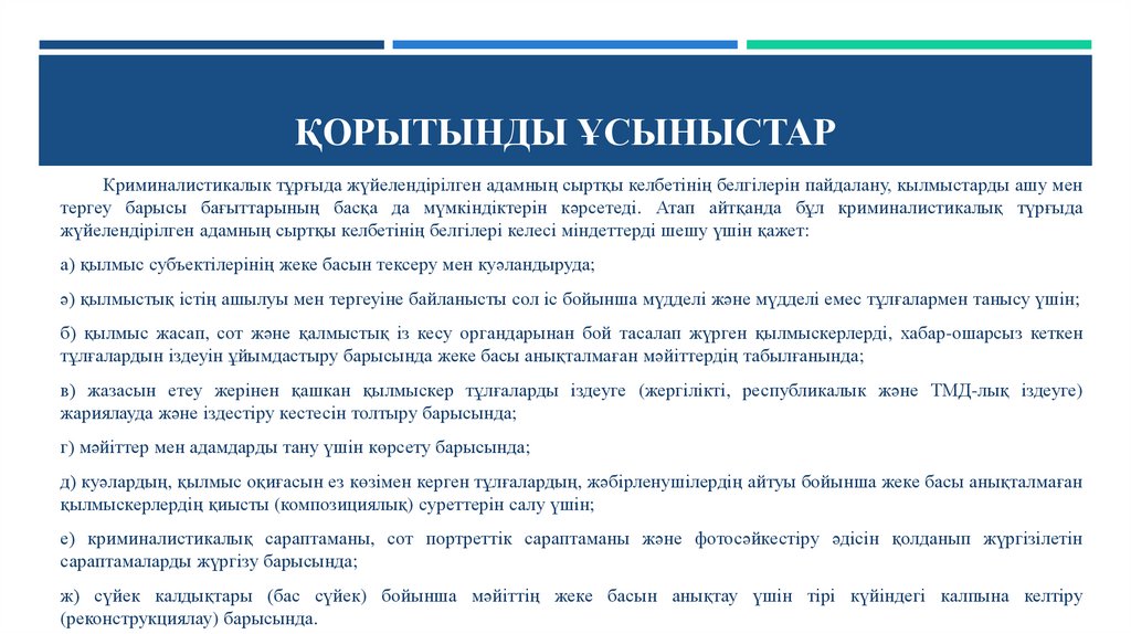 ҚОРЫТЫНДЫ ҰСЫНЫСТАРКриминалистикалык тұрғыда жүйелендірілген адамның сыртқы келбетінің белгілерін пайдалану, кылмыстарды ашу мен