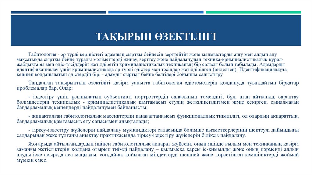 ТАҚЫРЫП ӨЗЕКТІЛІГІГабитология - әр түрлі керіністегі адамның сыртқы бейнесін зерттейтін және кылмыстарды ашу мен алдын алу