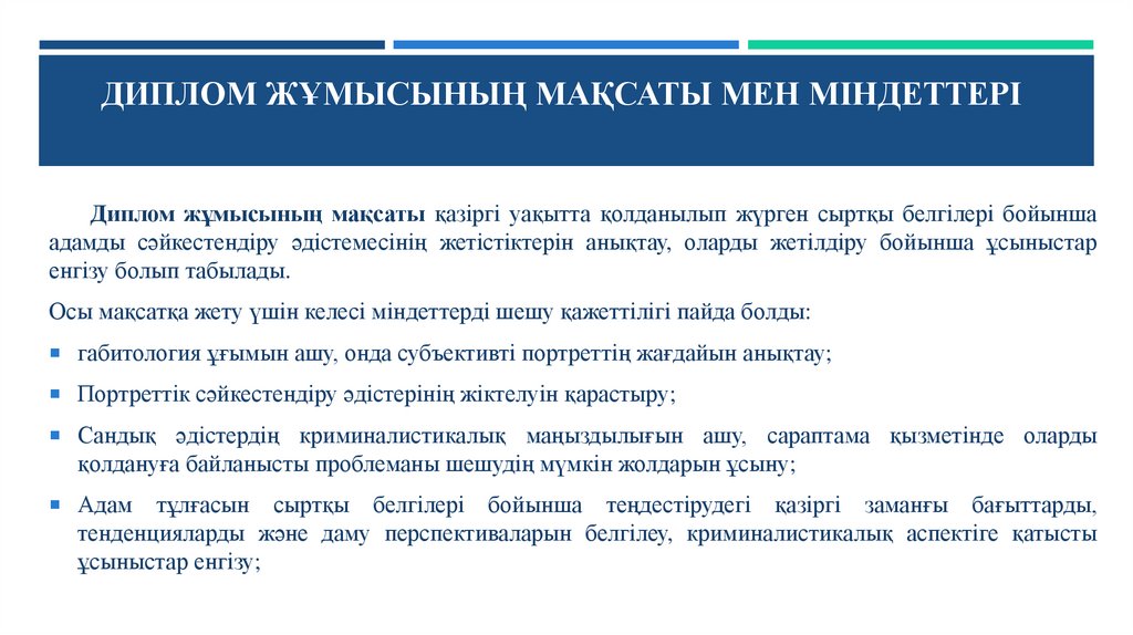 ДИПЛОМ ЖҰМЫСЫНЫҢ МАҚСАТЫ МЕН МІНДЕТТЕРІДиплом жұмысының мақсаты қазіргі уақытта қолданылып жүрген сыртқы белгілері бойынша