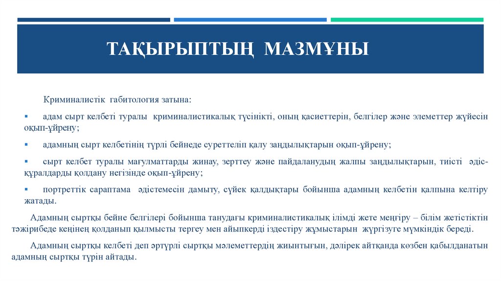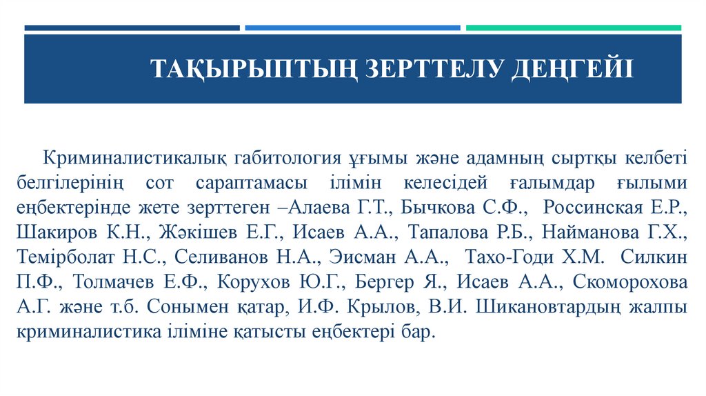 ТАҚЫРЫПТЫҢ ЗЕРТТЕЛУ ДЕҢГЕЙІКриминалистикалық габитология ұғымы және адамның сыртқы келбеті