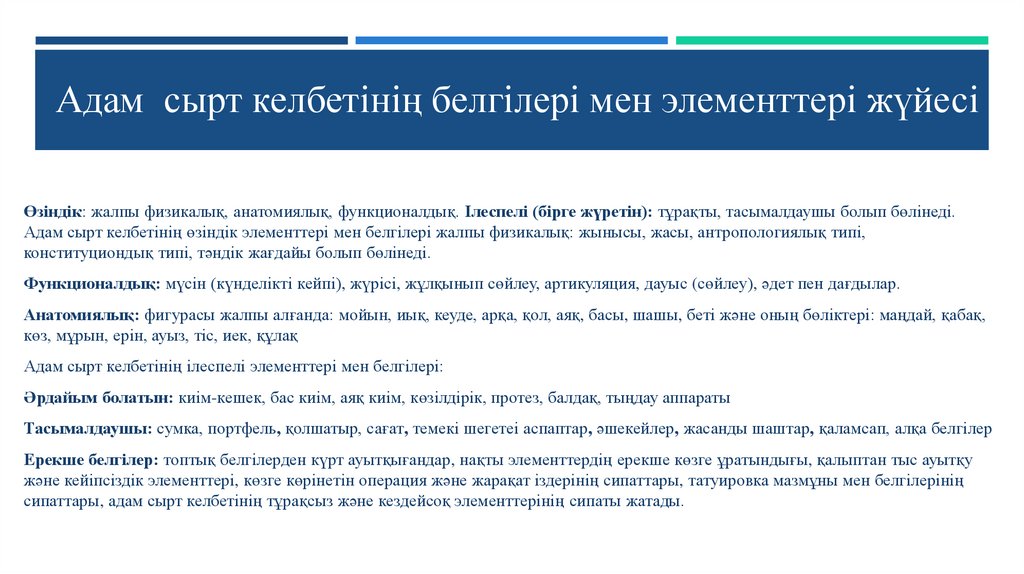 Адам сырт келбетінің белгілері мен элементтері жүйесіӨзіндік: жалпы физикалық, анатомиялық, функционалдық. Ілеспелі (бірге жүретін): тұрақты, тасымалдаушы болып бөлінеді.