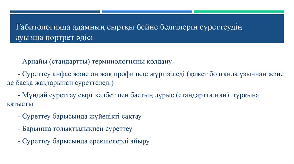 - Суреттеу анфас және оң жақ профильде жүргізіледі (қажет болғанда ұзыннан және