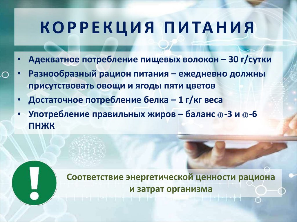 К О Р Р Е К Ц И Я П И ТА Н И Я• Адекватное потребление пищевых волокон – 30 г/сутки