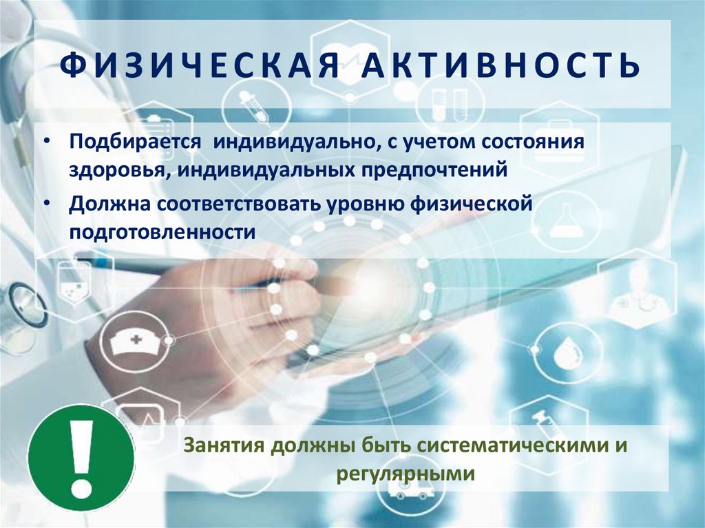 ФИЗИЧЕСКАЯ АКТИВНОСТЬ• Подбирается индивидуально, с учетом состояния