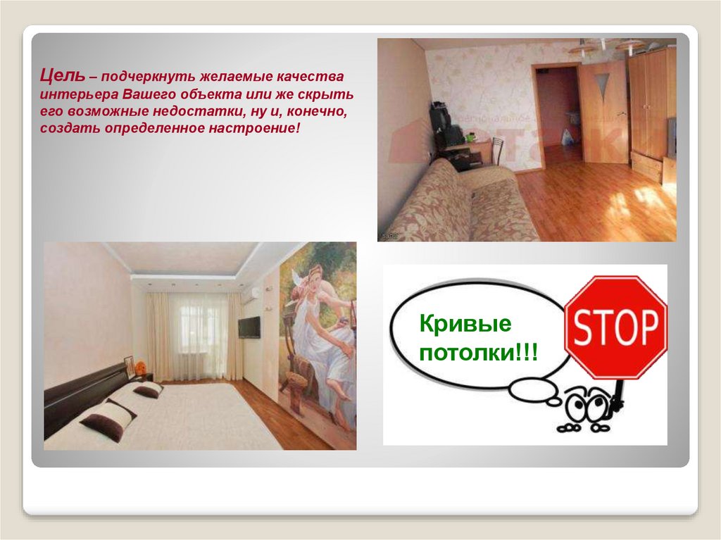 Цель – подчеркнуть желаемые качестваинтерьера Вашего объекта или же скрыть