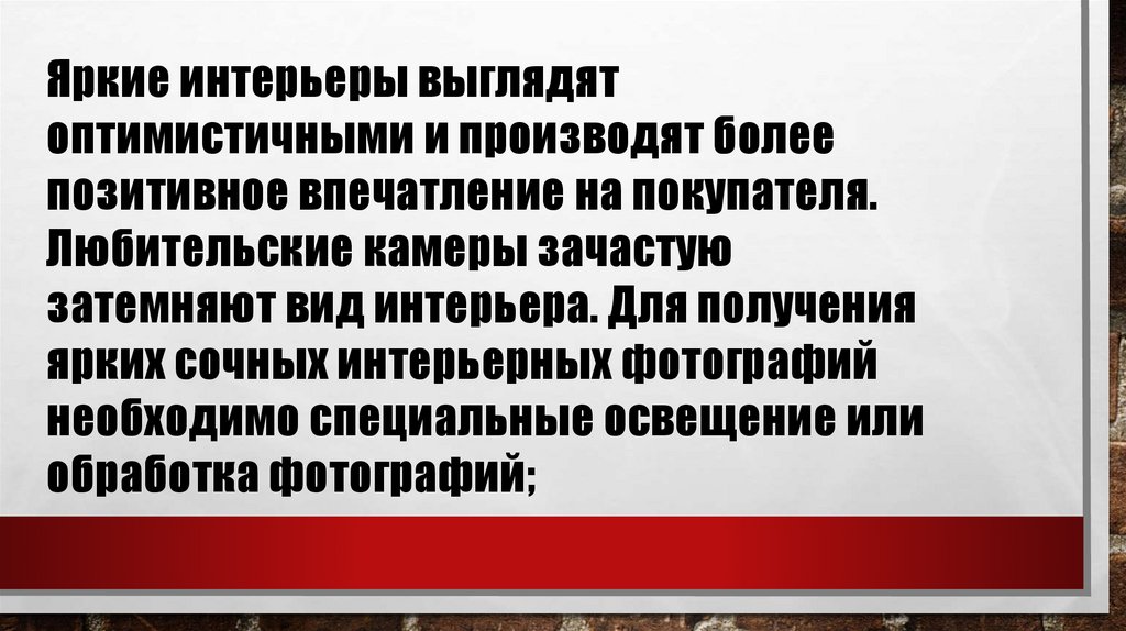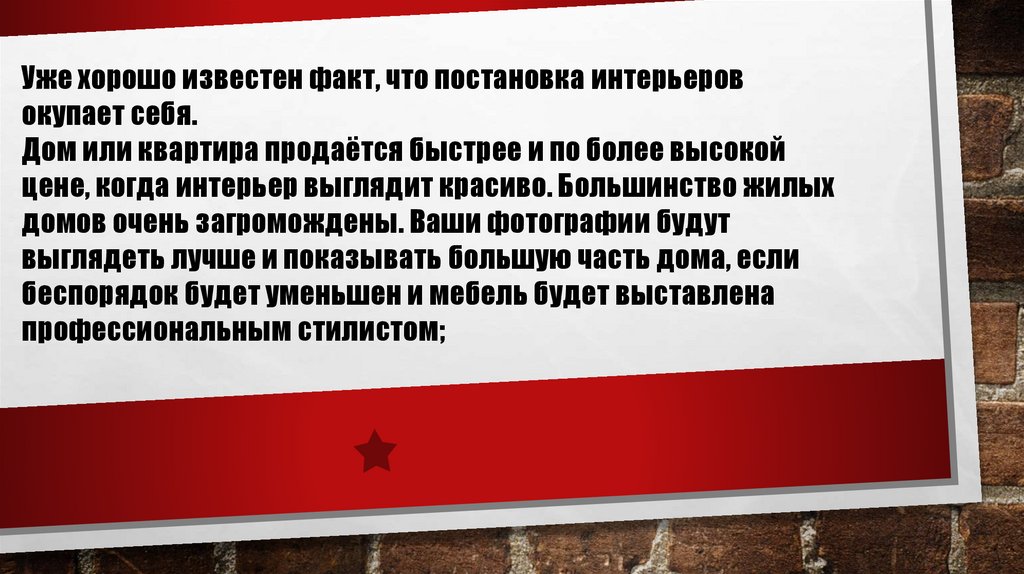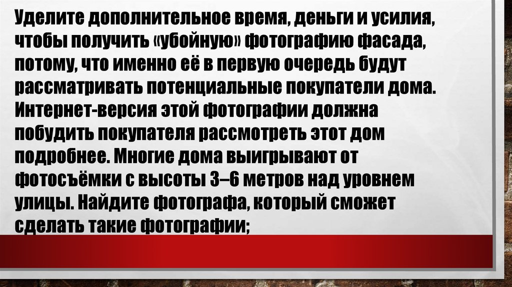 10. То, как фотографии представлены в интернете и печатных материалах, имеет оченьбольшое влияние на общую эффективность продажи недвижимости.