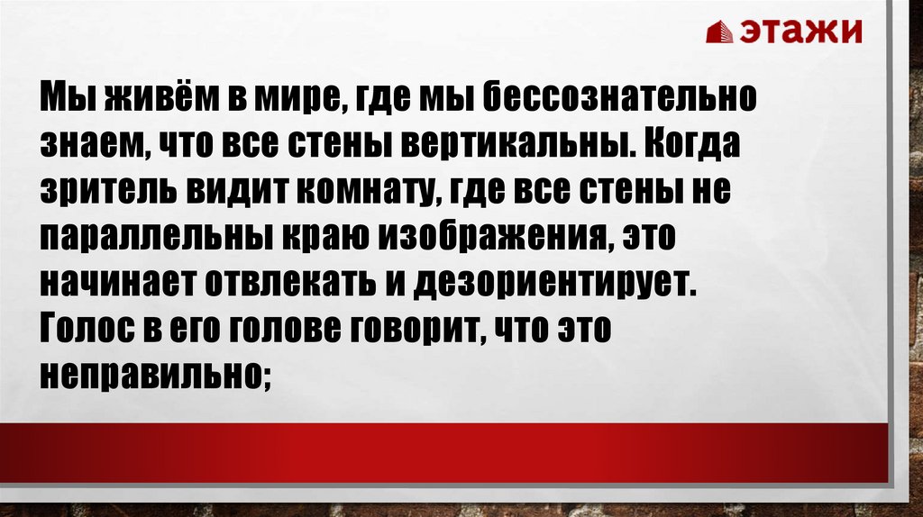 Мы живём в мире, где мы бессознательнознаем, что все стены вертикальны. Когда