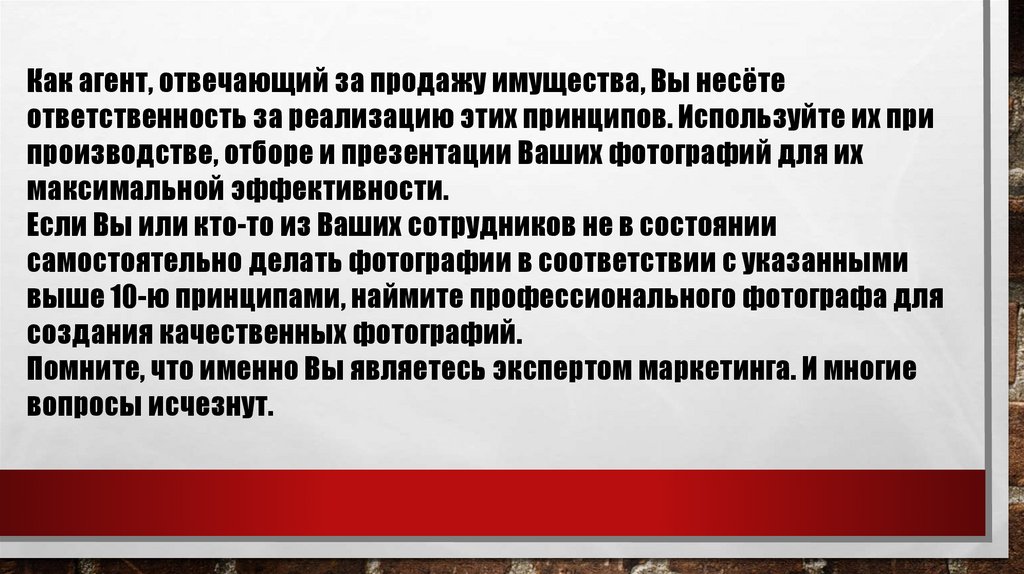 Как агент, отвечающий за продажу имущества, Вы несётеответственность за реализацию этих принципов. Используйте их при
