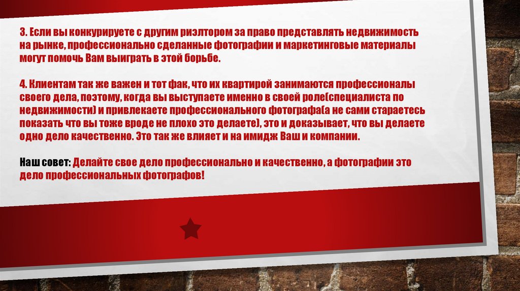 3. Если вы конкурируете с другим риэлтором за право представлять недвижимостьна рынке, профессионально сделанные фотографии и маркетинговые материалы
