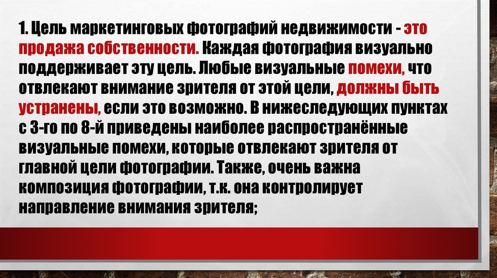 1. Цель маркетинговых фотографий недвижимости - этопродажа собственности. Каждая фотография визуально