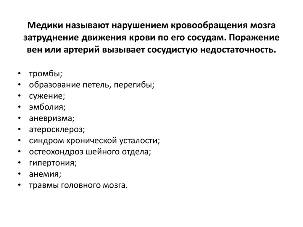 Медики называют нарушением кровообращения мозгазатруднение движения крови по его сосудам. Поражение