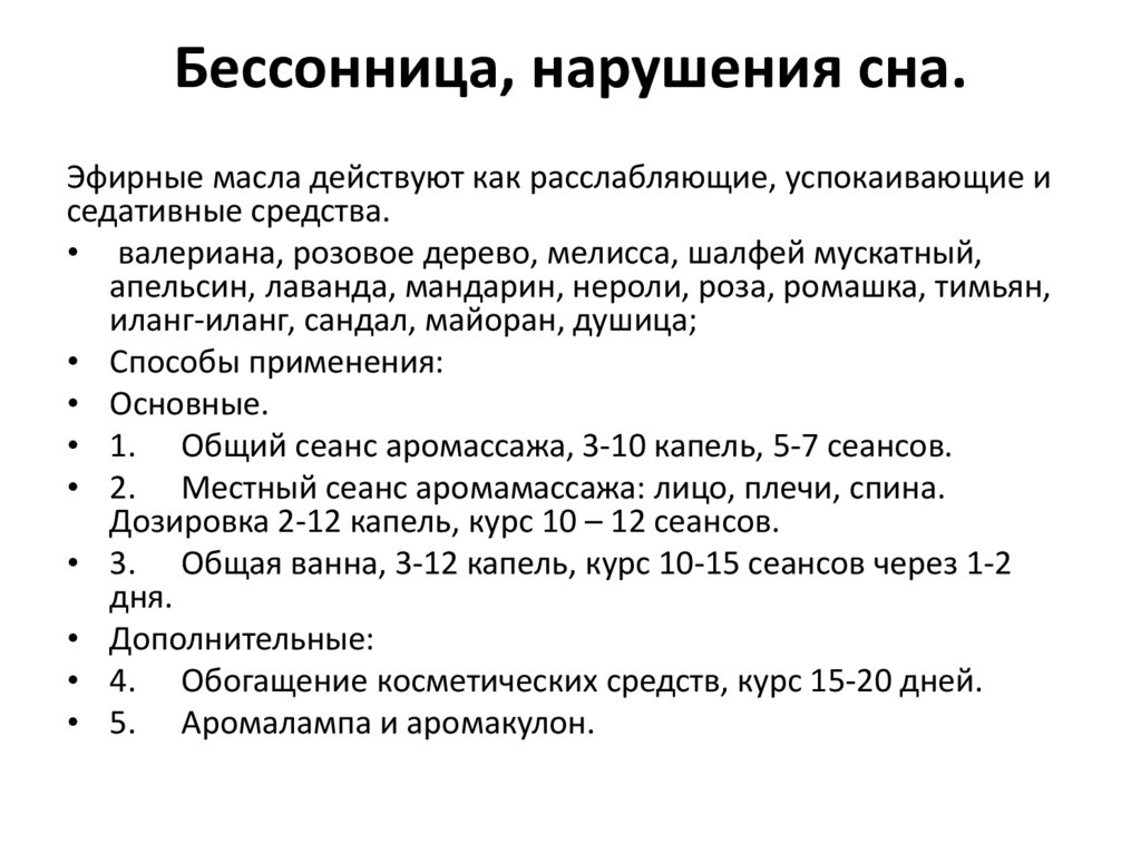 Бессонница, нарушения сна.Эфирные масла действуют как расслабляющие, успокаивающие и