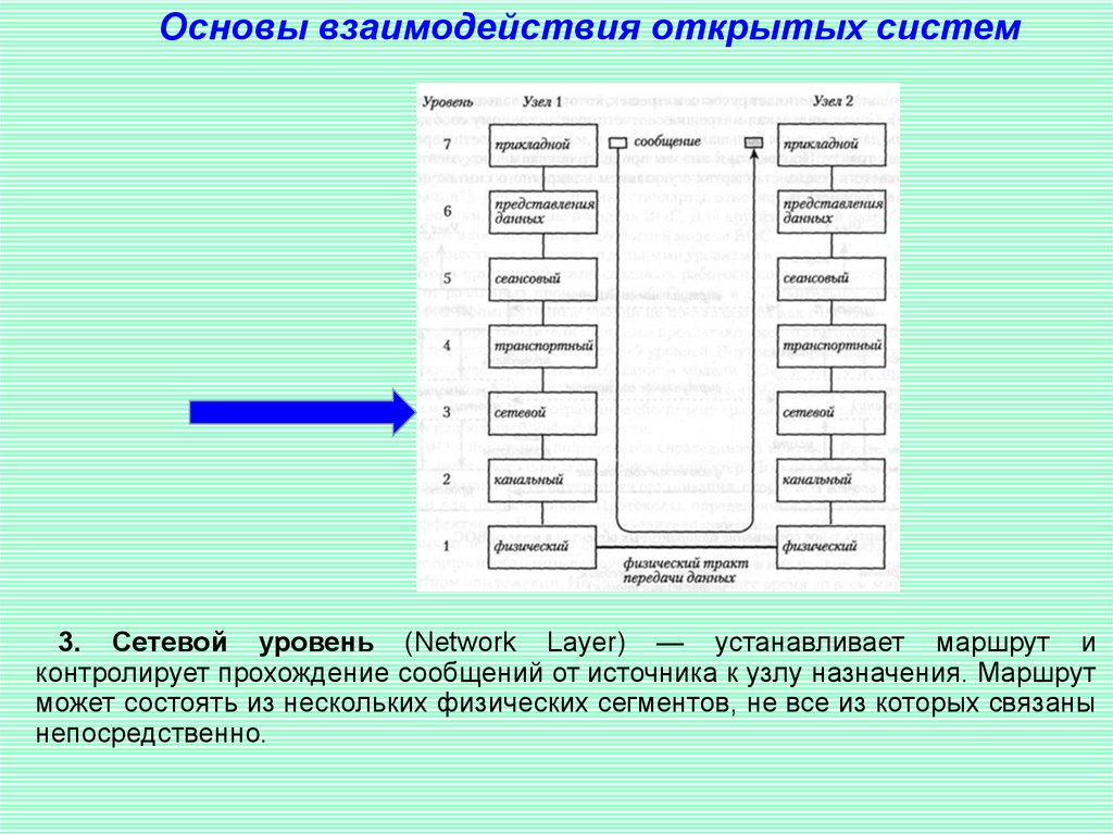 Основы взаимодействия открытых систем3. Сетевой уровень (Network Layer) — устанавливает маршрут и