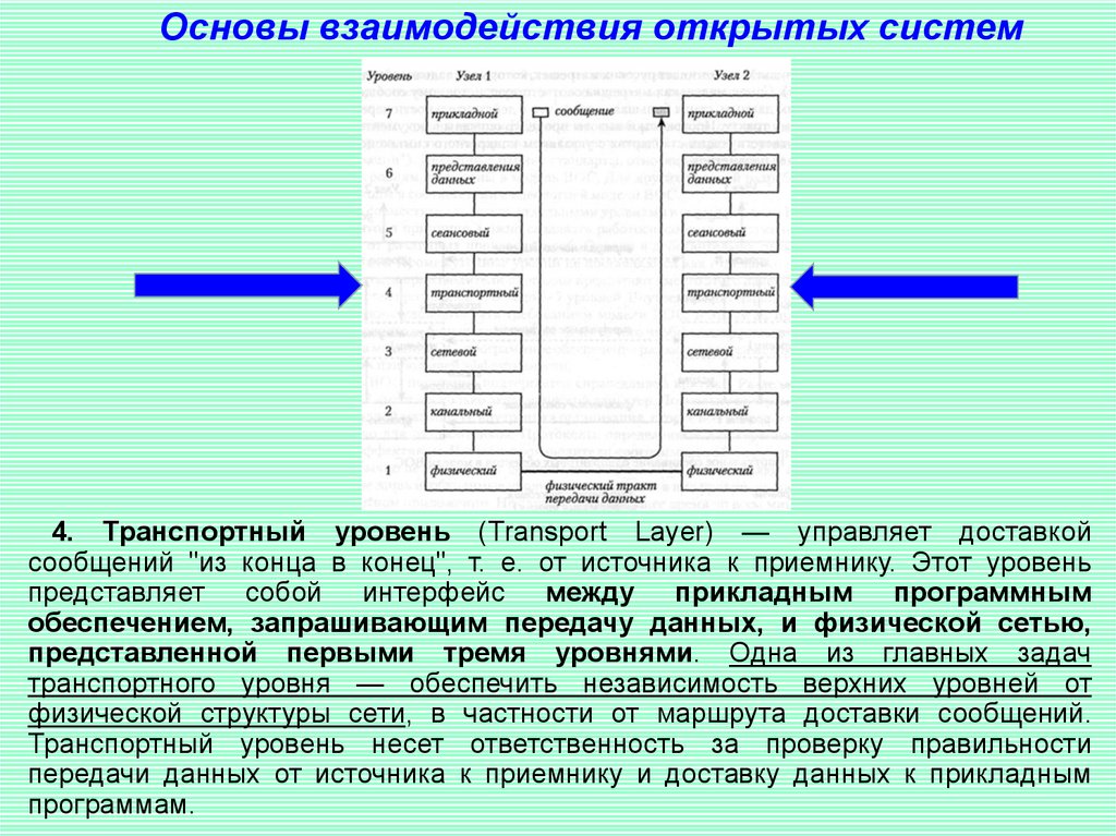 Основы взаимодействия открытых систем4. Транспортный уровень (Transport Layer) — управляет доставкой