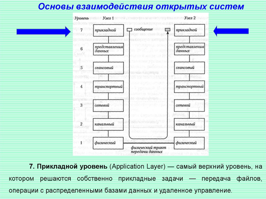 Основы взаимодействия открытых систем7. Прикладной уровень (Application Layer) — самый верхний уровень, на