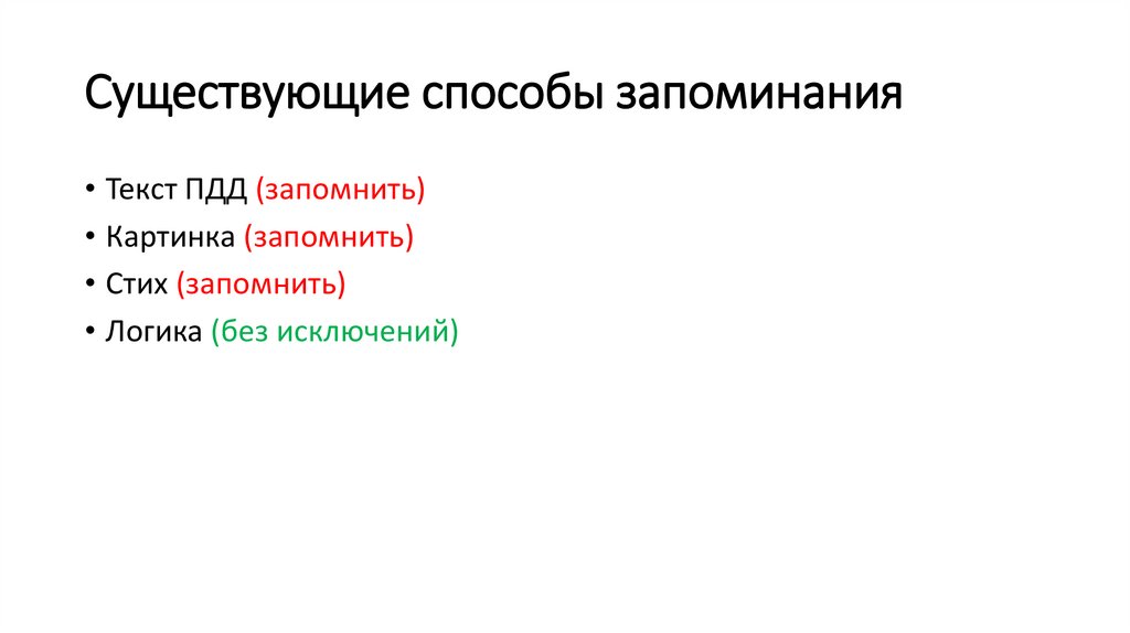 Существующие способы запоминания• Текст ПДД (запомнить)